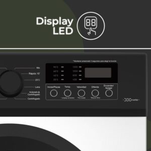 Estética blanca con puerta XXL transparente, tambor de acero inoxidable. Sistema de control electrónico con Display LED con 12 programas de lavado y funciones para garantizar el mejor resultado y cuidado en tu colada.